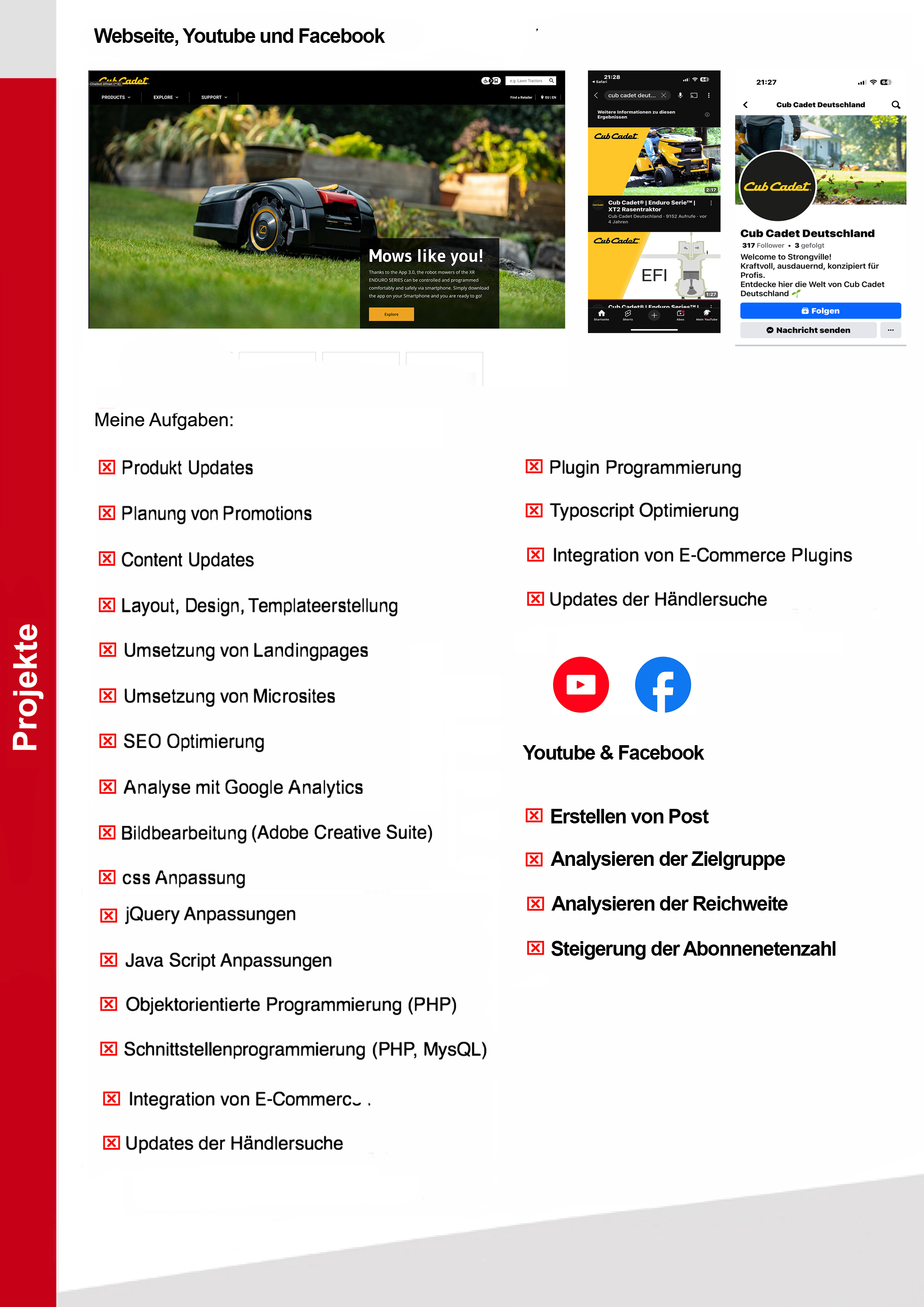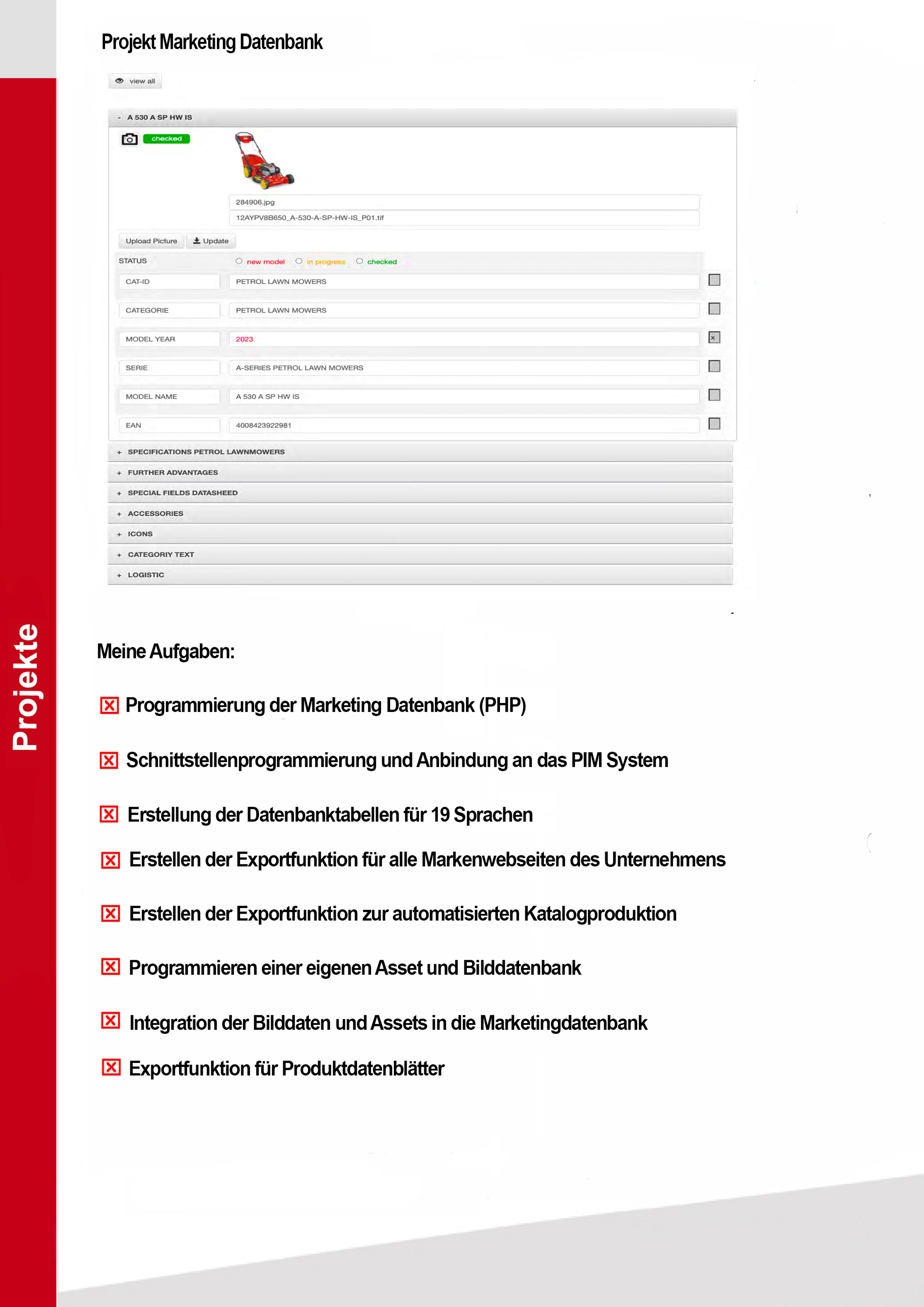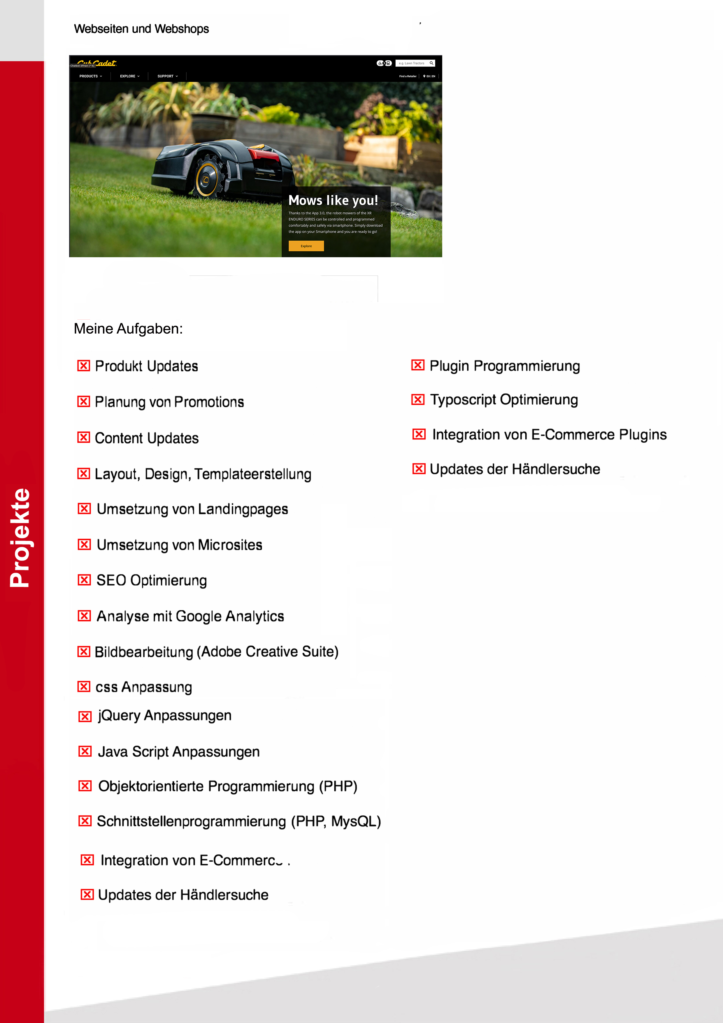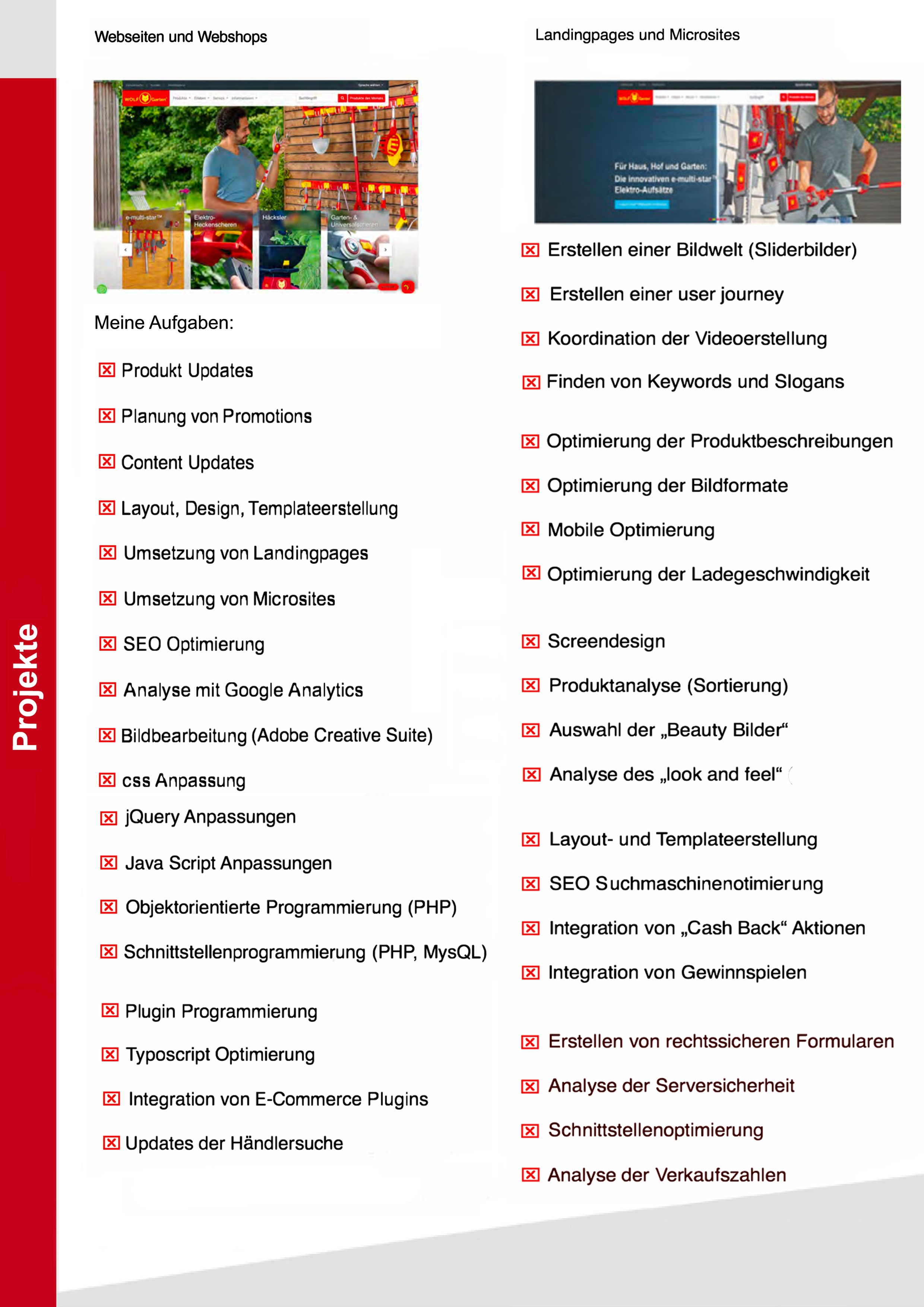 Meine 18-jährige Erfahrung als Designer und Webentwickler im Bereich Webdesign bzw. der Webprogrammierung befähigen mich alle Arten von Webseiten und E-Commerce Plattformen zu warten, gestalten und zu programmieren. Ausgehend von der Konzeption bis hin zu fertigen Lösung entwerfe ich Designvorlagen und programmiere auch individuelle Apps mit Datenbankanbindung an bestehende Systeme. Marketingmaßnahmen wie Google ads Kamagnien, Social Media Kampagnien, Gewinnspiele, SEO Optimierung, sowie die Erstellung medienwirksamer Plakate, Kataloge und Flyer gehören ebenso zu meinen Stärken wie die Durchführung und Planung von Projekten in Zusammenarbeit mit externen Agenturen in den führenden Projektmanagment Tools w.z.B Jira und Confluence. Event und Messeplanung und die Erstellung von verkaufsfördernten Maßnahmen gehören zu meinen speziellen Stärken. Meine sehr guten Englisch Kenntnisse erlauben mir Projekte auch im englischsprachigen Außland zu handeln.